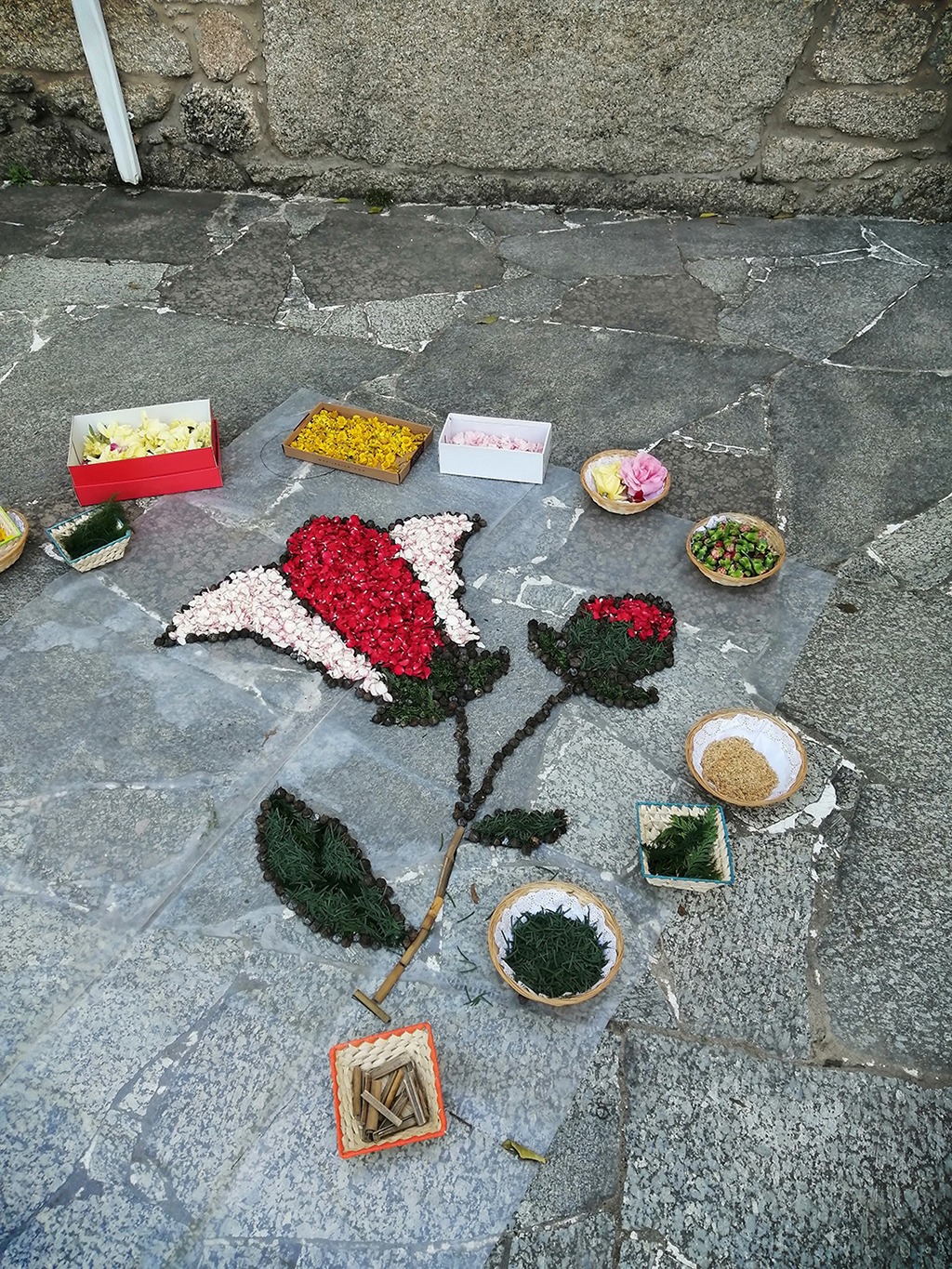 Aparte del fervor religioso la festividad es celebrada por miles de visitantes que acuden a disfrutar de las alfombras confeccionadas en una sola noche. Los vecinos se agrupan por calles y preparan el material durante el mes previo a la fiesta. Se busca una temática, se diseña el dibujo adaptándolo al tramo de calle y se busca el material que se va a utilizar dependiendo de la geometría y de la combinación de colores. Todo ello se guarda bajo estricto secreto hasta la noche anterior a la fiesta. Cada persona colabora en lo que sabe hacer. Los diseñadores pasan el dibujo a grandes plantillas de plástico que se pondrán en la calle para realizar el patrón; los más jóvenes ayudan a las personas expertas a deshojar flores y arbustos mientras aprenden la tradición; otros van al campo a buscar el material que se va guardando en lugares frescos hasta el momento del uso. También hay quien hace café y ofrece bizcocho para pasar las largas horas de trabajo después de la jornada laboral. El material usado es diverso, árnica, coca, carriza, fiuncho, hortensia, pampullo…pero se va innovando cada año llegando a teñirse alguna planta del color que “falta”. También se usa arena, serrín y otros materiales.
