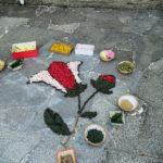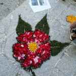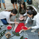 Aparte del fervor religioso la festividad es celebrada por miles de visitantes que acuden a disfrutar de las alfombras confeccionadas en una sola noche. Los vecinos se agrupan por calles y preparan el material durante el mes previo a la fiesta. Se busca una temática, se diseña el dibujo adaptándolo al tramo de calle y se busca el material que se va a utilizar dependiendo de la geometría y de la combinación de colores. Todo ello se guarda bajo estricto secreto hasta la noche anterior a la fiesta. Cada persona colabora en lo que sabe hacer. Los diseñadores pasan el dibujo a grandes plantillas de plástico que se pondrán en la calle para realizar el patrón; los más jóvenes ayudan a las personas expertas a deshojar flores y arbustos mientras aprenden la tradición; otros van al campo a buscar el material que se va guardando en lugares frescos hasta el momento del uso. También hay quien hace café y ofrece bizcocho para pasar las largas horas de trabajo después de la jornada laboral. El material usado es diverso, árnica, coca, carriza, fiuncho, hortensia, pampullo…pero se va innovando cada año llegando a teñirse alguna planta del color que “falta”. También se usa arena, serrín y otros materiales.