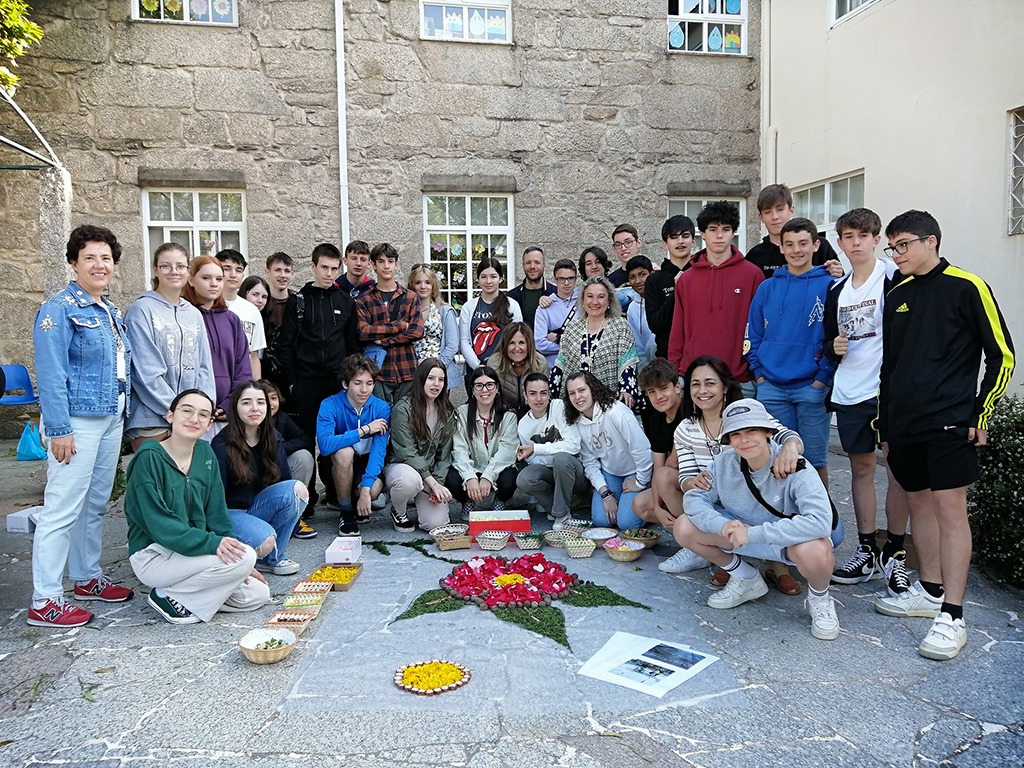 Para acercar a nuestro alumnado a esta tradición común a Ponteareas y Bruselas preparamos una actividad en la que confeccionaron varios tapices a pequeña escala. Primero estuvieron aprendiendo sobre el evento visualizando vídeos de la escuela de alfombristas. Después, ayudados y guiados por miembros de la asociación y por personal del concello de Ponteareas, formaron equipos, prepararon el material y se pusieron manos a la obra. Los chicos y chicas de Galicia les iban mostrando a sus compañeros belgas el nombre en gallego de las flores y hojas más utilizadas. Fue una gran experiencia y les gustó mucho.